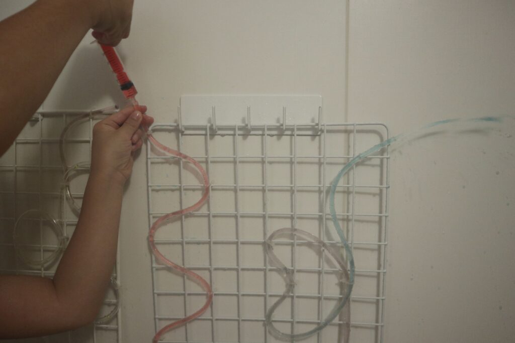 色を変えてみたり、注射器で空気だけを入れて残った水を押し出してみたり、ぶらさげる向きを変えてみたり…いろんなことを試して楽しんでいました。