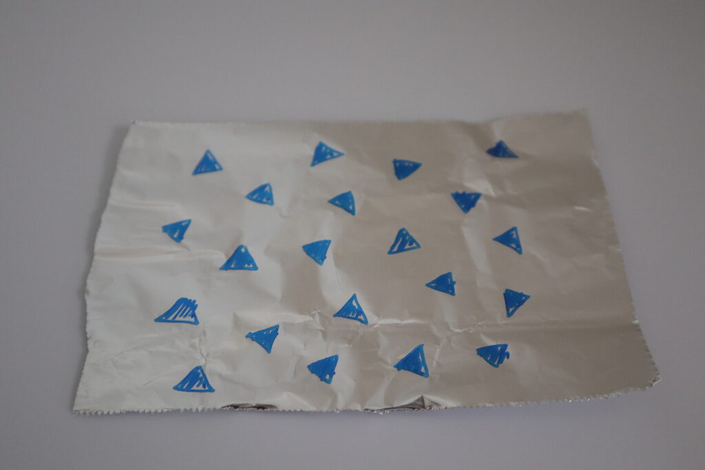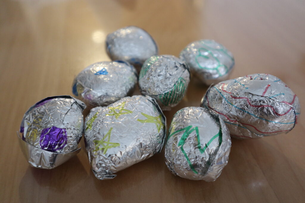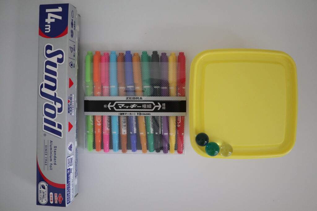 「あるもの」とは、ビー玉のことでした!ビー玉はアルミホイルに包まれますが、念のため誤飲にはご注意ください。油性ペンは、まわりに絵を描きたい場合に使います。
