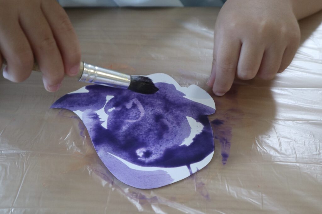 今回は紫とオレンジを用意してみました♩水を多めに絵の具を溶いておくと塗りやすいし、下絵が絵の具をはじきやすい!