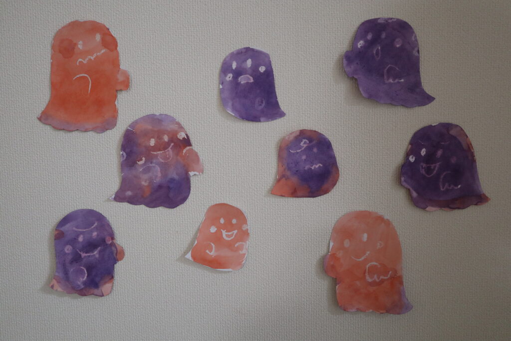 今回は、「はじき絵」という技法を使ってハロウィンの工作をしてみました。「はじき絵」とは、油と水が混ざり合わない性質を利用した技法です。今回はろうそくの油分が絵の具を弾いて、おばけの顏が白く浮き出ました。