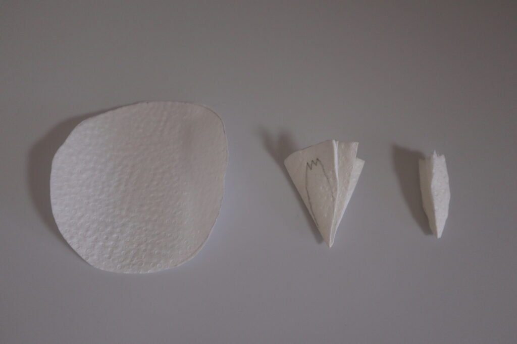 キッチンペーパーをカットするときは、開くとどんな形になるかな?と想像しながら切って開いてみるのが楽しく、3回折るところを2回だったら?4回だったら?と試してみるのもいいかもしれません。