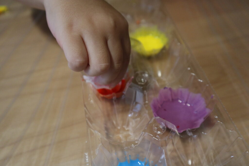 今回は卵パックに絵の具を用意しました♩適度な深さがあって便利!