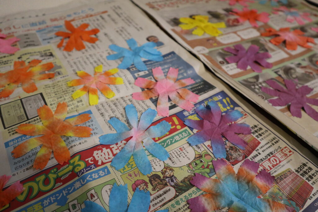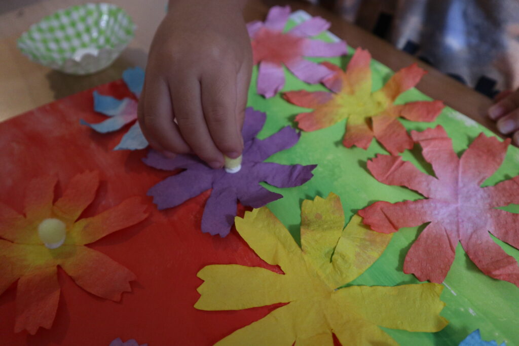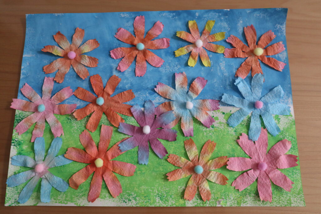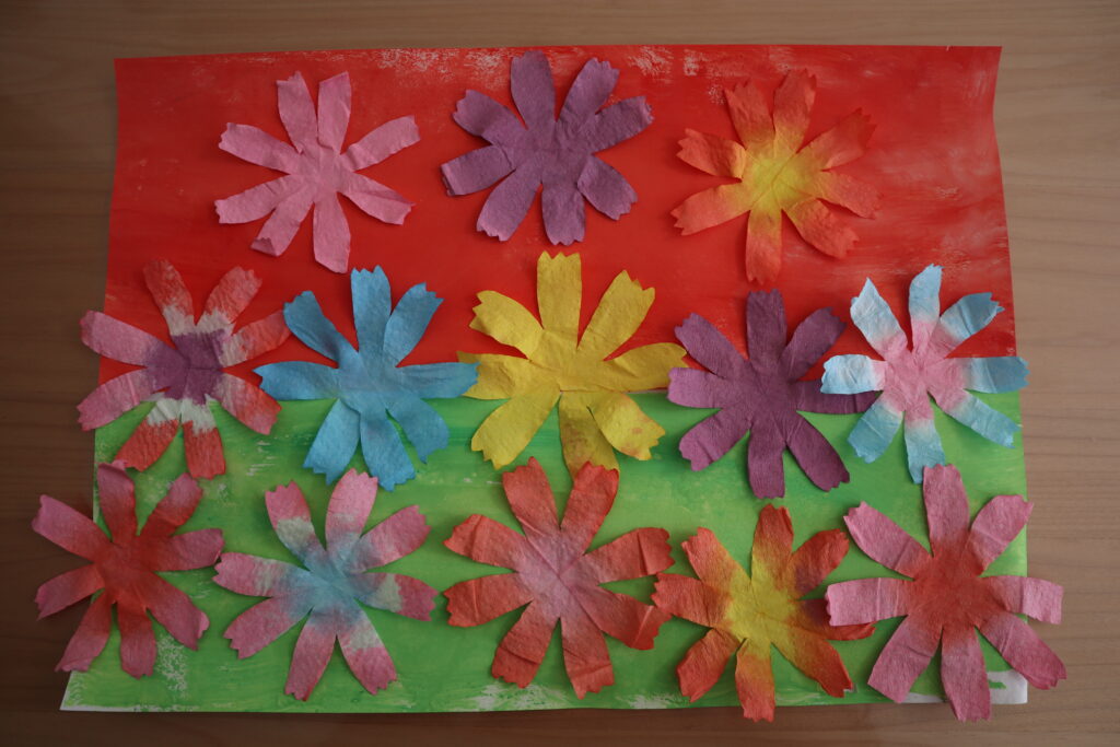 今回は、子どもたちとキッチンペーパーを絵の具で染めてコスモス畑を描いてみました。