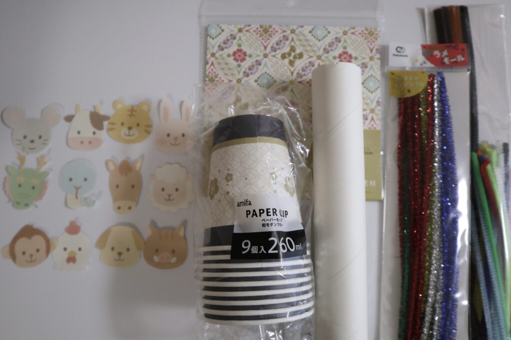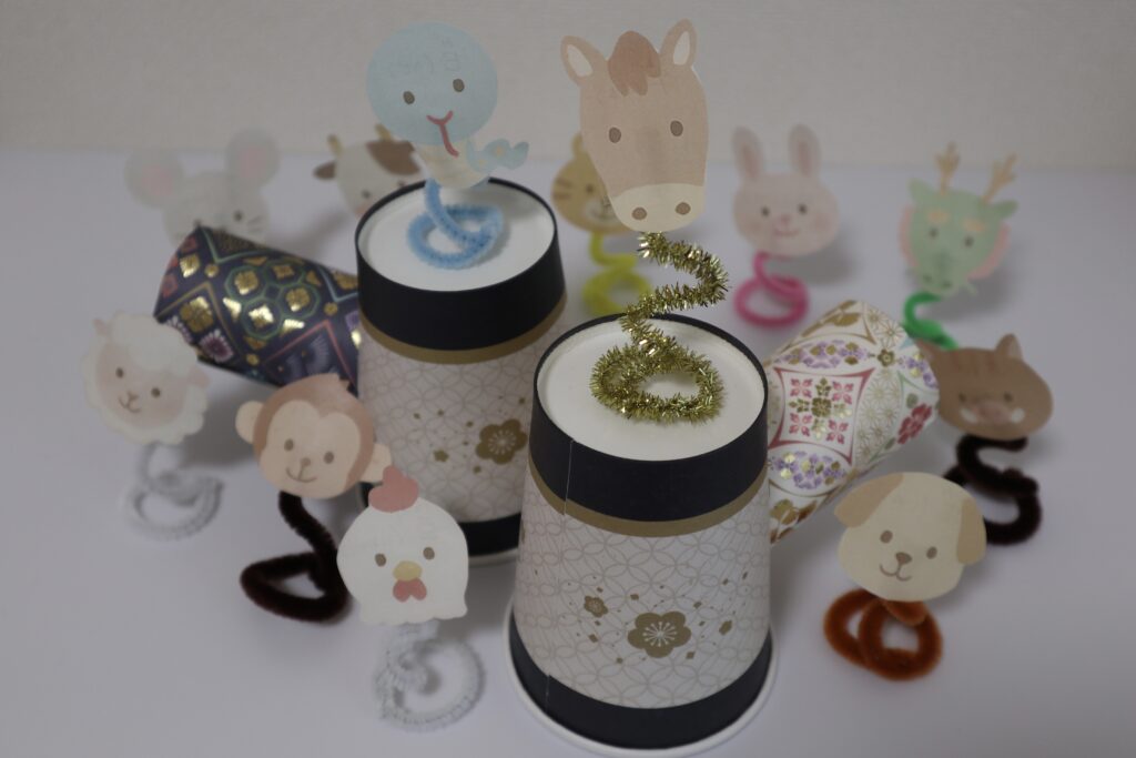 今回は、干支モチーフということで、お正月らしい和柄の紙コップや千代紙を使用しました。