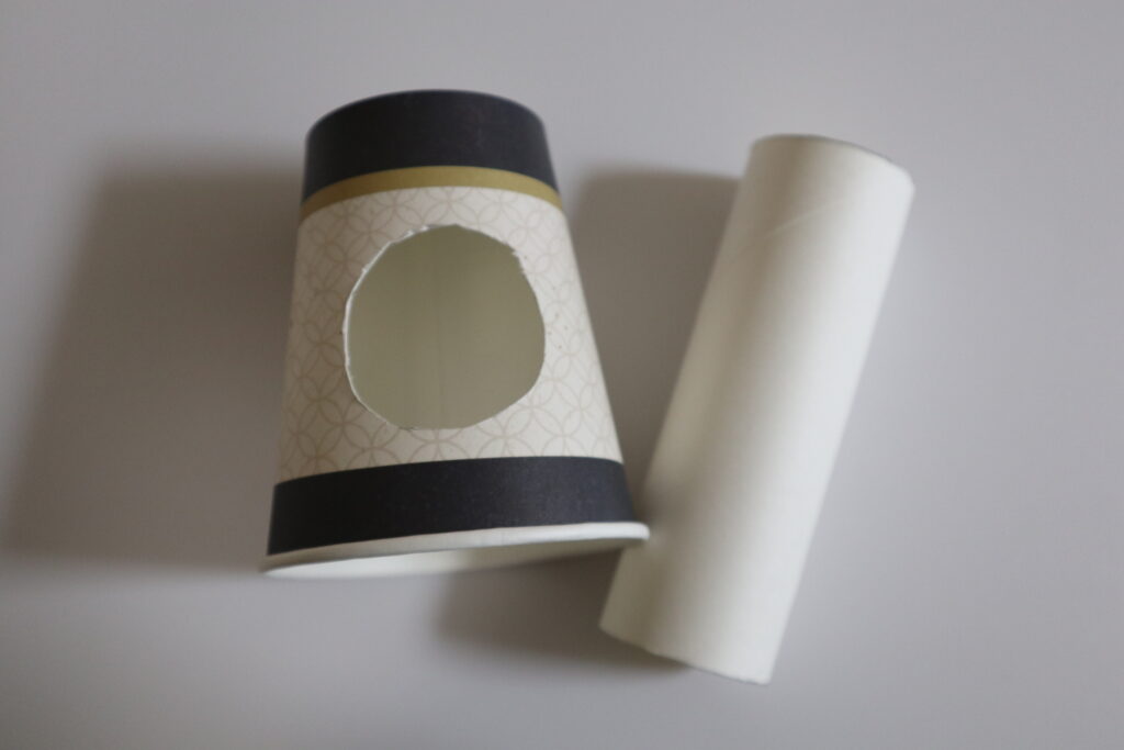 ・紙コップにペーパー芯の直径と同じ大きさの穴をあける