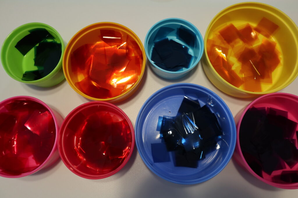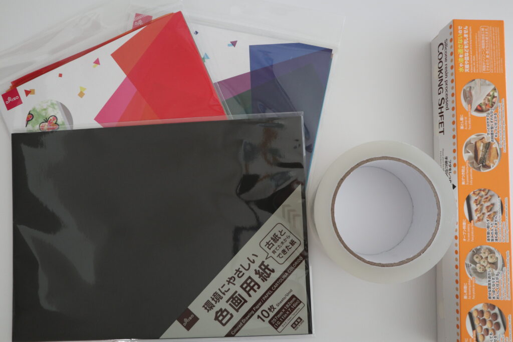 全て100均でも購入できるのでお手軽♩特にカラーセロファンは別の工作にも使えるので、我が家では常備しています。画像のものは結構1枚1枚が大きい商品でした◎