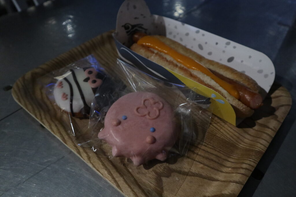 ギンを見ながらくつろぐこともできます。私の選んだホットドッグは、思っていたより本格的で、ソーセージがジューシーでおいしい!次男は可愛いドーナツを嬉しそうにほおばっていました。